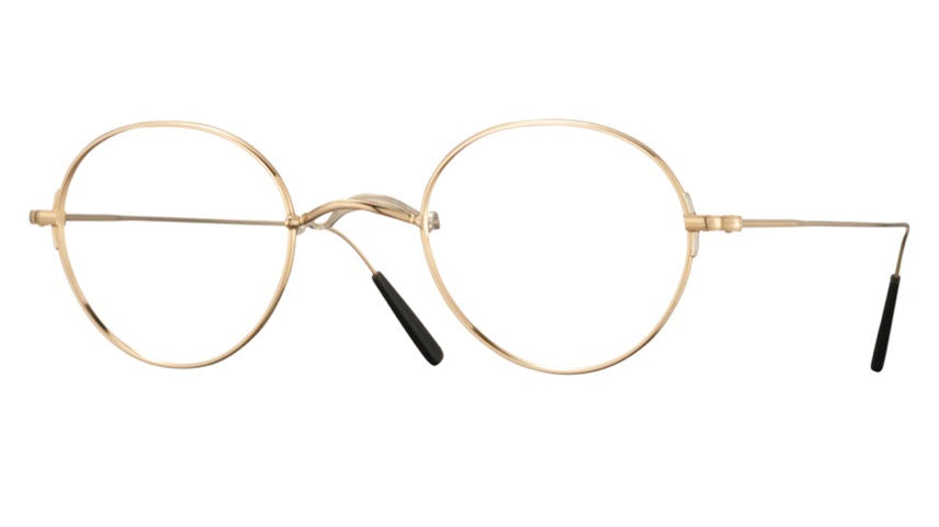 These are elegant round wire-frame glasses with a delicate gold-tone finish throughout. The frames feature a classic circular silhouette with minimal and refined styling. The thin metal construction gives them a lightweight and sophisticated appearance, with traditional nose pads for comfort. The temple arms are slim and complement the overall minimalist aesthetic. These glasses have a timeless, intellectual appeal that would suit many face shapes and personal styles.