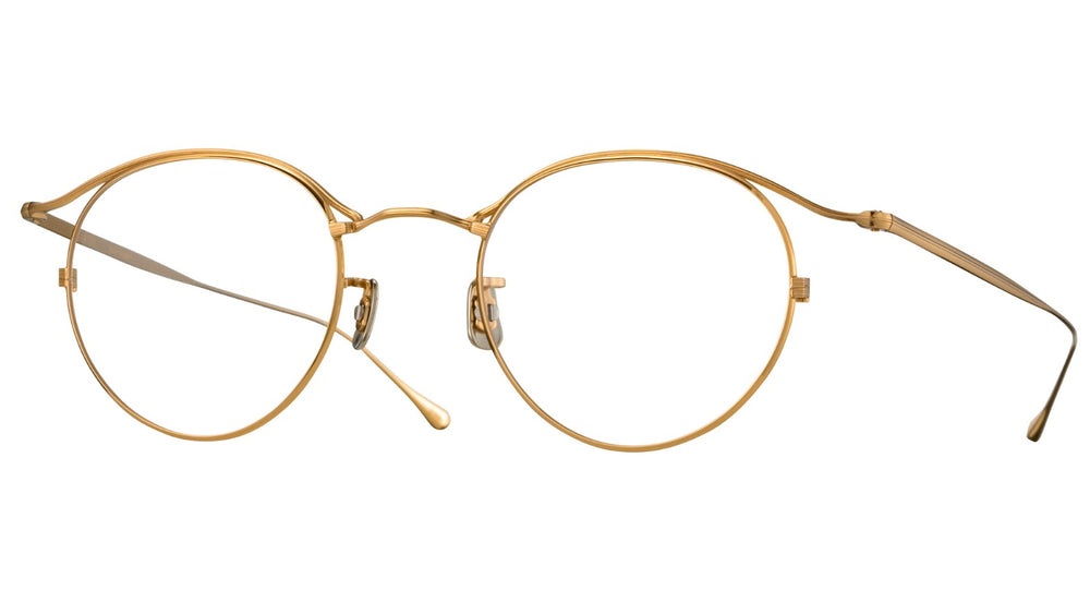 Classic round gold-tone metal eyeglasses with a minimalist vintage-inspired design. Features delicate wire rims, adjustable nose pads, and slim temple arms with subtle curves. The frame has a refined, intellectual aesthetic with clean lines and excellent craftsmanship typical of high-end Japanese eyewear.