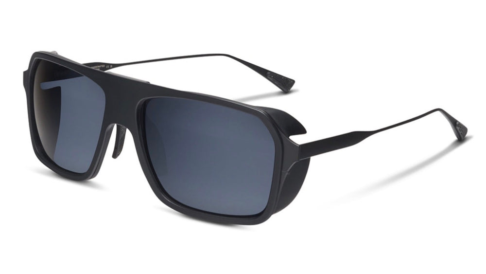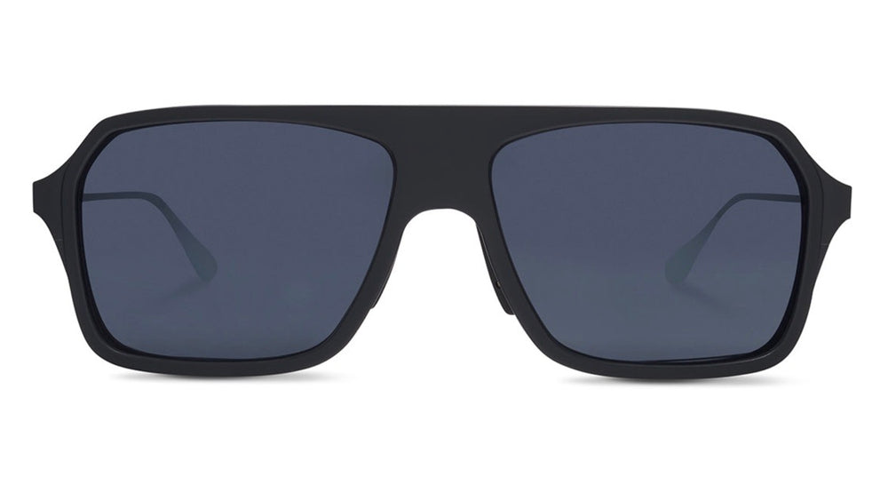 These are bold, masculine sunglasses with a contemporary square silhouette and substantial frame thickness. The design features a monochromatic black colorway throughout, with dark grey lenses creating a sleek, professional appearance. The frames have a modern, architectural quality with clean lines and a strong bridge structure. The overall aesthetic is minimalist yet commanding, suitable for both formal and casual wear. The temples appear to have a straight, no-nonsense design that complements the angular front frame.