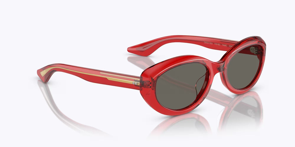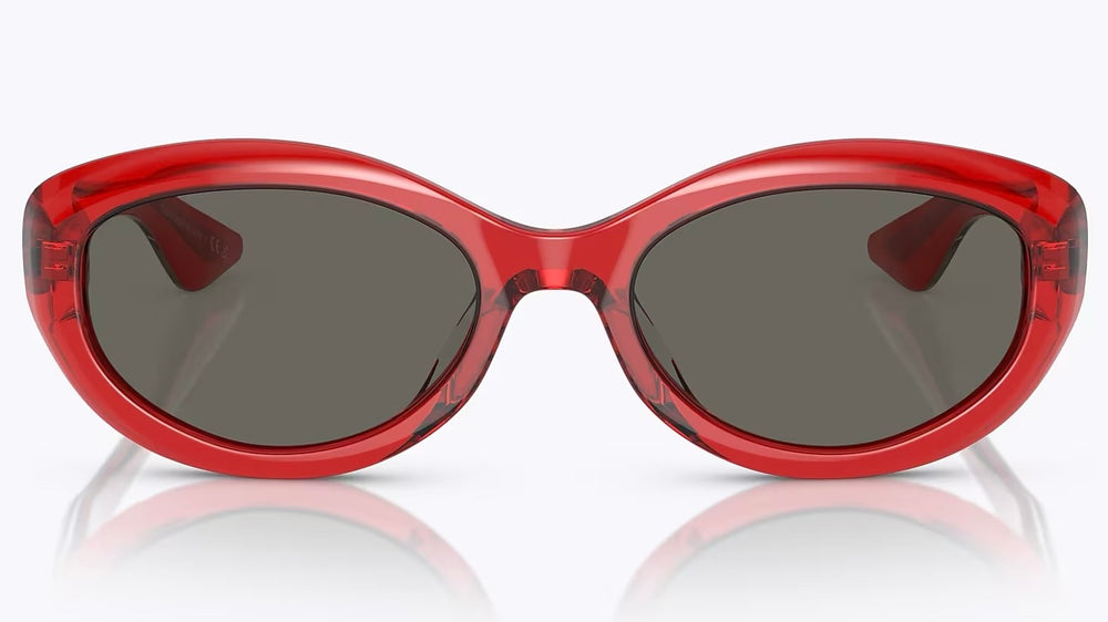 Stylish oval-shaped sunglasses with a translucent cherry red frame. The design features a sleek, retro-inspired silhouette with dark grey lenses. The frame has a uniform thickness throughout, creating a bold yet elegant look. The sunglasses showcase a clean, minimalist aesthetic with smooth curves and seamless integration between the front frame and temple arms. The overall design strikes a perfect balance between vintage charm and contemporary styling.