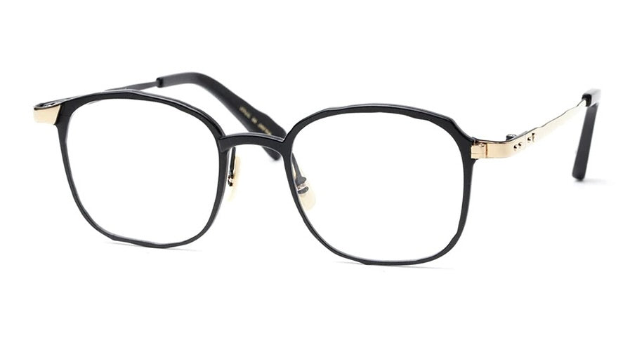 Contemporary square frames with a sophisticated blend of black and gold accents. Features a sleek metal construction with a refined black finish on the front and elegant gold temple arms. The design balances modern minimalism with classic styling, making it suitable for professional and casual wear. The frame exhibits clean lines with subtle architectural details at the temple hinges.