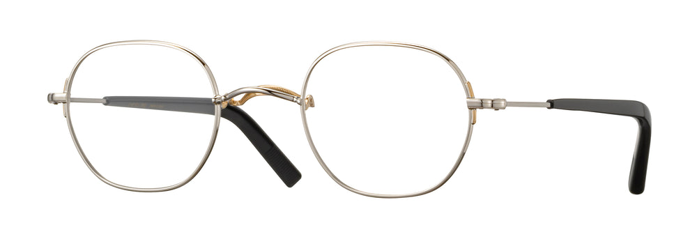 Classic round metal-framed eyeglasses with a delicate silver finish and minimalist design. Features a thin wire frame construction with adjustable nose pads and black temple tips. The timeless design exhibits Japanese craftsmanship with its precise detailing and balanced proportions. The glasses have a vintage-inspired aesthetic while maintaining a contemporary appeal through their clean lines and lightweight structure.
