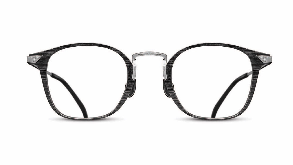 A sophisticated pair of vintage-inspired geometric glasses featuring a textured black metallic frame with a brushed, woodgrain-like finish. The design combines modern minimalism with retro aesthetics, featuring sleek angular lines and a distinctive flat brow bar. The frames have a refined thin profile with subtle silver accents at the hinges and nose bridge, creating an intellectual yet fashion-forward appearance. The transparent lenses are housed in a well-proportioned geometric shape that would complement most face shapes.