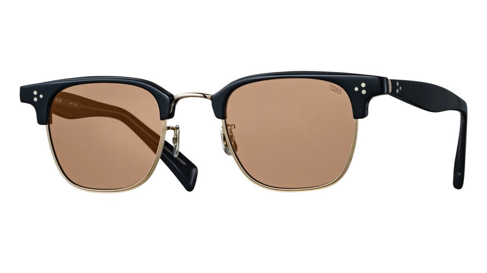 Classic clubmaster-style sunglasses featuring a sophisticated combination of black upper frame and gold-tone lower rim. The design showcases distinctive dot details on the front corners, brown-tinted lenses, and a refined semi-rimless construction. The temple arms are crafted in matte black plastic with a sleek taper. The style balances vintage inspiration with modern elegance, making it suitable for both casual and formal occasions.