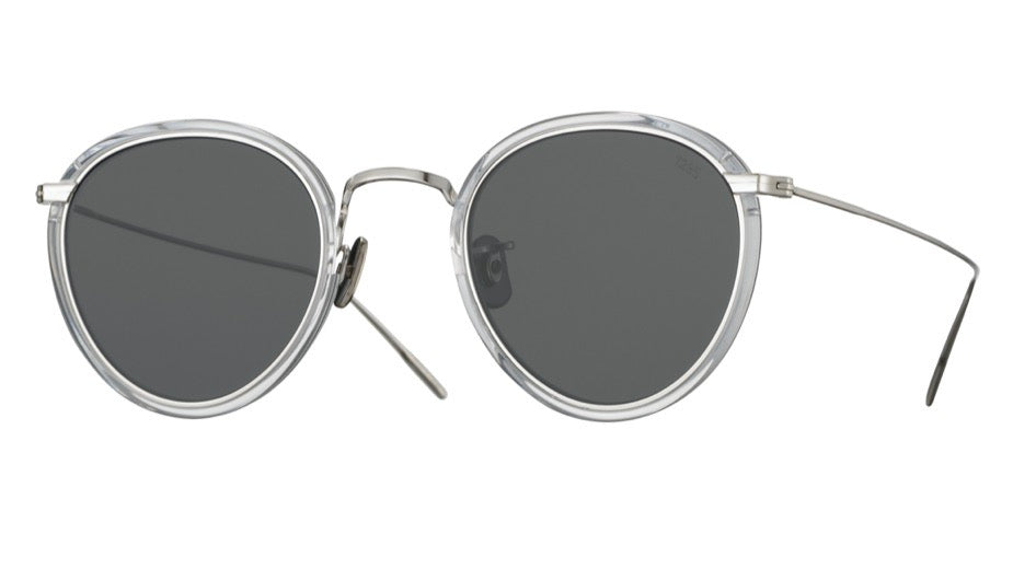 These sleek round-frame sunglasses feature a minimalist transparent acetate rim around metallic silver frames. The design combines vintage and modern aesthetics with its clean lines and subtle double-layered construction. The frames appear lightweight and refined, with slim temple arms and a classic nose bridge design, making them a sophisticated choice for everyday wear.
