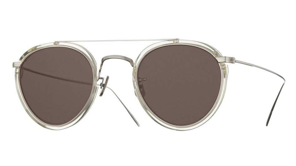 These are sophisticated circular sunglasses featuring a delicate double bridge design with a transparent-to-silver metallic frame. The sunglasses showcase a minimalist yet luxurious aesthetic with slim temple arms and a clean silhouette. The brown-tinted lenses are complemented by the subtle metallic finish, creating a refined and contemporary look suitable for any occasion.