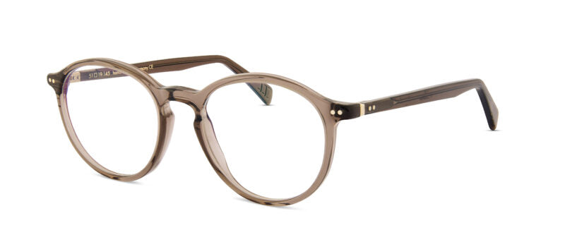 These elegant round eyeglasses feature a translucent bronze acetate frame with a classic pantos shape. The design includes subtle metal rivets on the temple hinges for added sophistication. The frames have a refined retro-intellectual aesthetic with clean lines and balanced proportions. The saddle bridge offers comfortable fit, while the combination of transparent lenses and warm bronze coloring creates a versatile, timeless look suitable for any face shape.