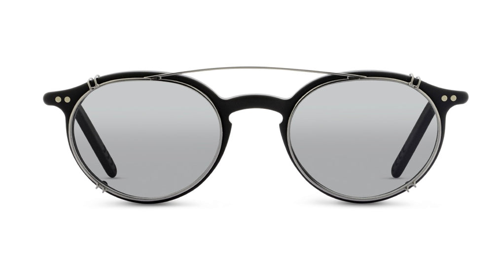 A sophisticated round frame design featuring a sleek black metal construction with a distinctive double bridge detail. The glasses showcase a clip-on sunlens system with grey-tinted lenses, creating a versatile eyewear option. The design combines classic aesthetics with modern functionality, featuring delicate metal nose pads and thin temple arms that maintain an elegant profile. The frame demonstrates excellent craftsmanship with its precise metal work and refined finishing touches, including subtle rivets at the temple joints.