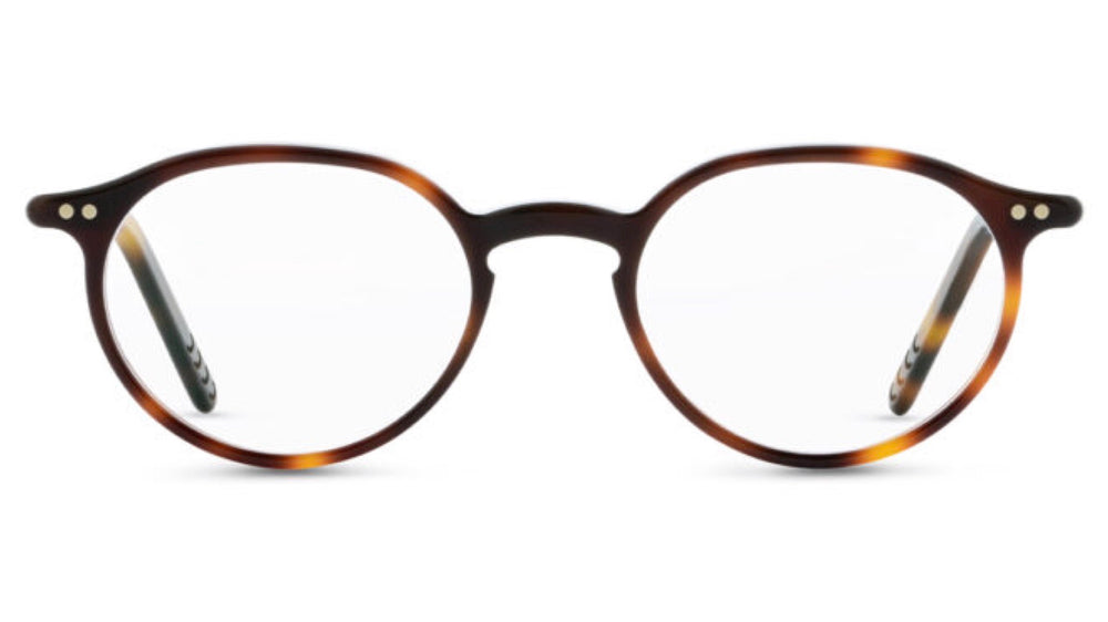 These are sophisticated round-framed glasses with a classic tortoiseshell pattern in warm brown tones. The frame features a traditional P3 shape with subtle detailing, including small rivets on the front corners. The design exhibits excellent craftsmanship with smooth transitions in the acetate material. The glasses have a timeless, intellectual aesthetic that would suit both casual and formal wear. The tortoiseshell pattern shows varying depths of color, from lighter amber to deeper brown tones, creating a rich, dimensional appearance.