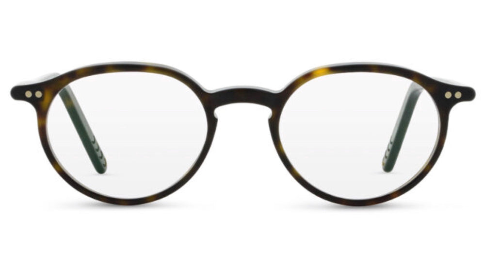 Classic round P3-style eyeglasses with a refined tortoiseshell acetate frame featuring delicate rivets at the temple hinges. The frame has a sophisticated vintage-inspired look with a slender profile and subtle warm tones in the tortoise pattern. The perfectly circular lenses are complemented by thin temple arms and a minimalist bridge design, creating an intellectual, timeless aesthetic typical of the Lunor brands attention to detail and craftsmanship.