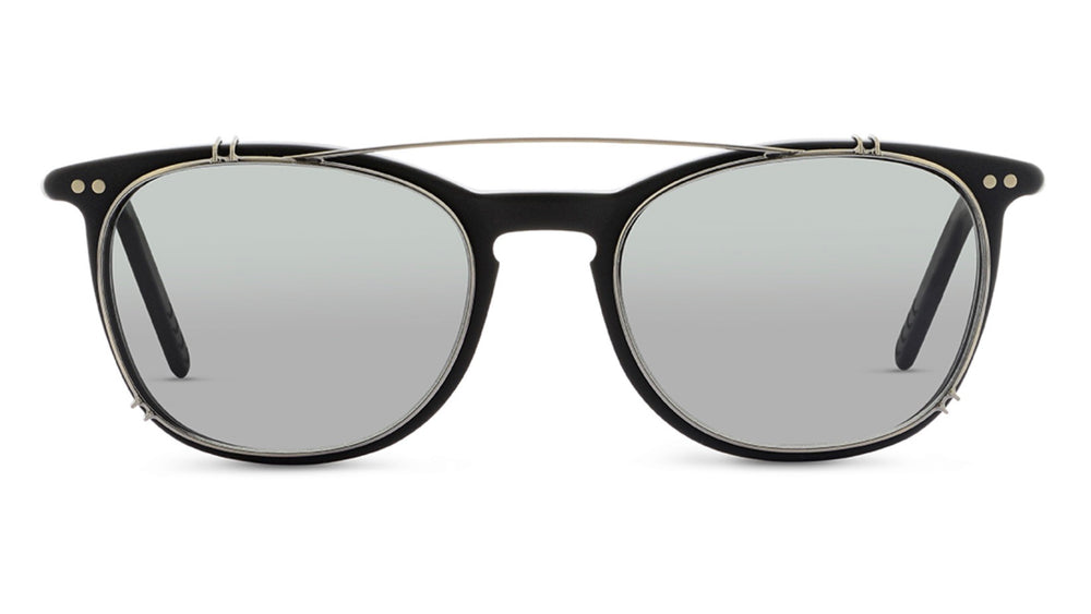 These sophisticated oval-shaped eyeglasses feature a refined clip-on design with a sleek black frame and silver metal accents. The glasses showcase a minimalist aesthetic with subtle studded detailing at the temple hinges. The clip-on sunglasses portion perfectly matches the frame shape, providing versatile functionality while maintaining an elegant, timeless appearance. The design demonstrates excellent craftsmanship with its precise engineering and high-quality materials.