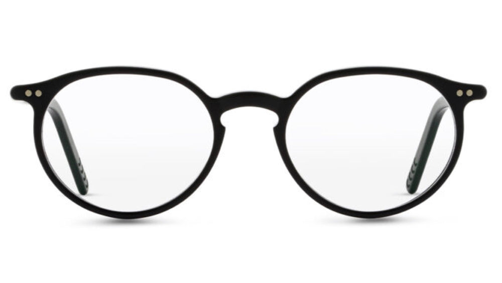 Classic round Lunor eyeglasses featuring a minimalist design with a thin black metal frame. The frame has a timeless P3 shape with subtle double dot rivets on the front corners. The design showcases clean lines with a traditional saddle bridge and slim temples, embodying sophistication and vintage-inspired aesthetics. The transparent lenses are housed in perfectly circular eye rims, making these glasses highly versatile for everyday wear while maintaining an intellectual, refined appearance.