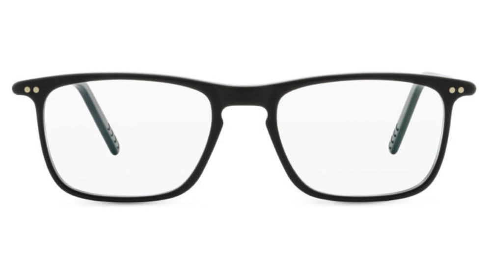 The LUNOR A5 238 features a sleek rectangular frame with a sophisticated minimalist design. The thin metal construction gives these glasses a lightweight and refined appearance. Small circular rivets on the temple corners add subtle detailing. The classic black finish creates a timeless look suitable for professional or casual wear. The frame has clean lines with slightly rounded edges for a contemporary yet versatile aesthetic.