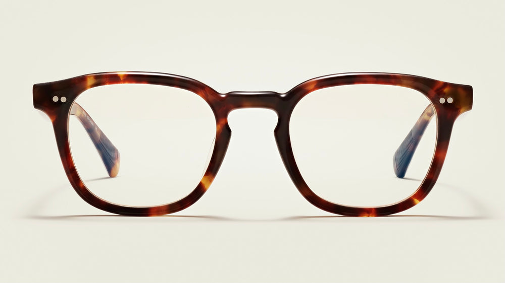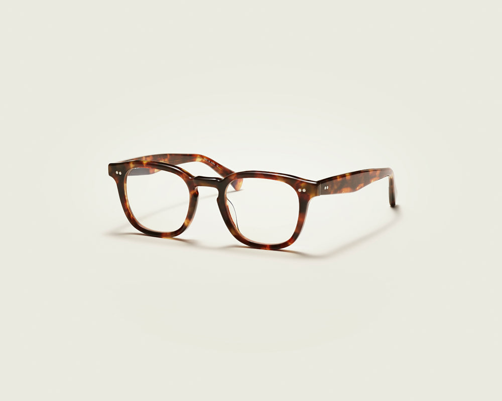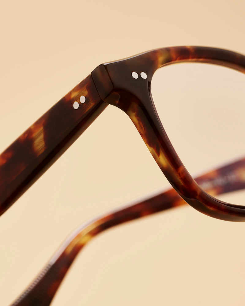 Classic tortoiseshell square frame glasses with a warm brown mottled pattern. The frames feature a traditional saddle bridge and subtle double dot rivets on the front corners. The glasses have a refined, intellectual aesthetic with clean lines and a medium-thick acetate construction that feels substantial yet balanced. The tortoise coloring shows rich variations of amber and dark brown tones throughout.