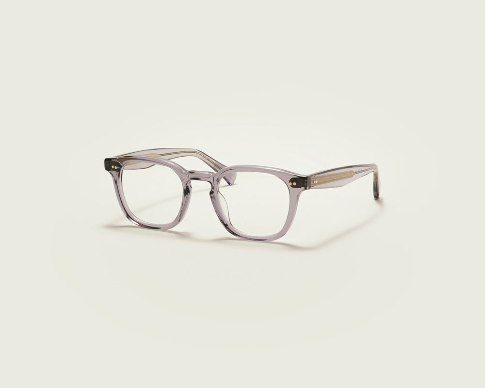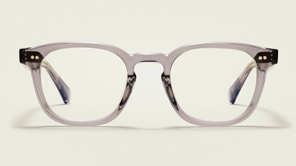 These are sophisticated square-framed glasses with a translucent grey acetate construction. The frame features a contemporary design with subtle metal rivets on the front corners. The temples appear to have a subtle texture or pattern. The overall aesthetic is modern and minimalist, with clean lines and a professional appearance that would suit various face shapes. The medium-weight frame provides a balanced look thats neither too bold nor too subtle.