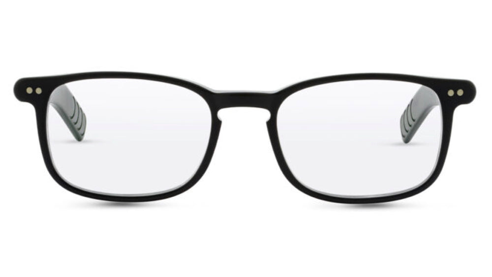 Classic rectangular frames in matte black with a minimalist design. Features subtle double rivets on the front corners and clean lines throughout. The frames have a professional, sophisticated look with a comfortable saddle bridge and streamlined temple arms. The medium thickness provides durability while maintaining a lightweight feel. Perfect for everyday wear in professional or casual settings.