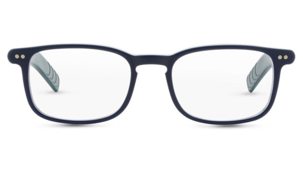 Classic rectangular navy blue frames with a sophisticated professional look. The frames feature a clean minimalist design with subtle double dots on each temple. The medium-thick construction offers durability while maintaining a refined appearance. The temple arms appear to have subtle texturing or patterns, adding visual interest while maintaining the overall understated aesthetic.