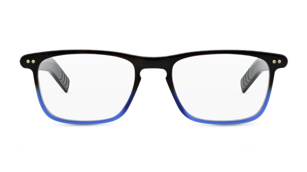 Modern rectangular frames featuring a sleek gradient design transitioning from black at the top to vibrant blue at the bottom. The frame has a sophisticated professional look with subtle metal rivets on the front corners. The design combines classic professionalism with a contemporary color accent, making it suitable for both office wear and casual settings. The frames have clean lines and a well-balanced proportion that would complement most face shapes.