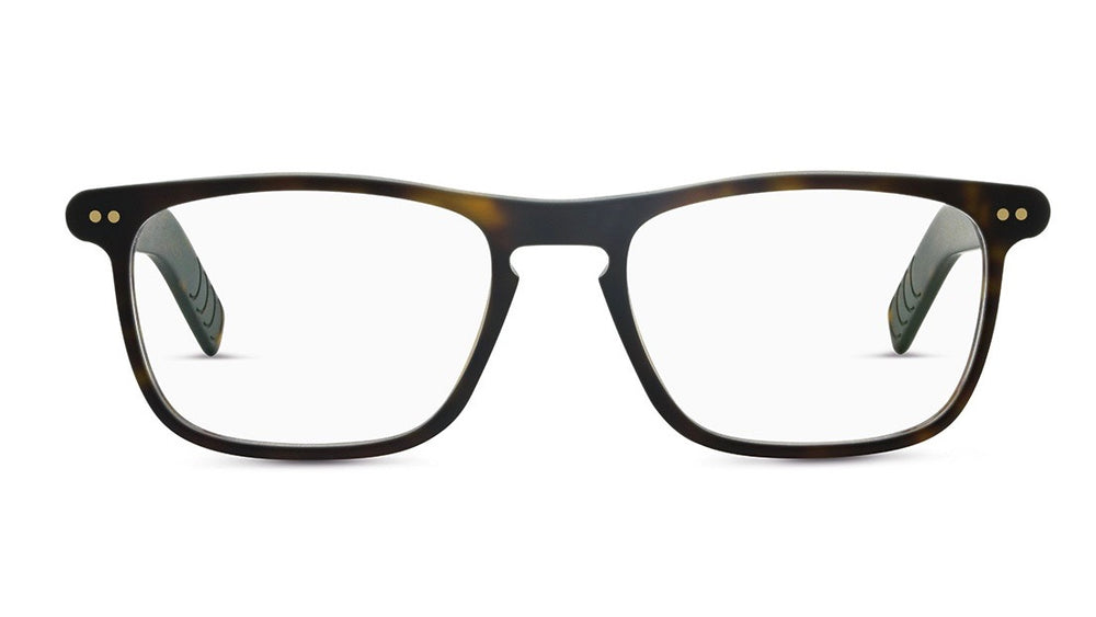 Classic rectangular acetate frame in a sophisticated tortoise pattern. Features clean lines with subtle vintage-inspired details including small rivets on the front corners. The saddle bridge and medium-weight construction provide comfort and durability. The frame has a refined professional look suitable for everyday wear.