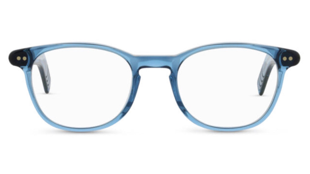 Classic vintage-inspired round-oval frames in a translucent powder blue acetate. Features signature riveted temples with subtle metallic accents. The frame has a refined academic aesthetic with a slightly upswept browline and softly curved edges. The saddle bridge provides comfortable fit while maintaining the streamlined retro design. Perfect for those seeking a sophisticated, intellectual look with a subtle pop of color.