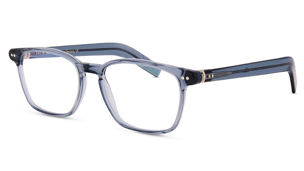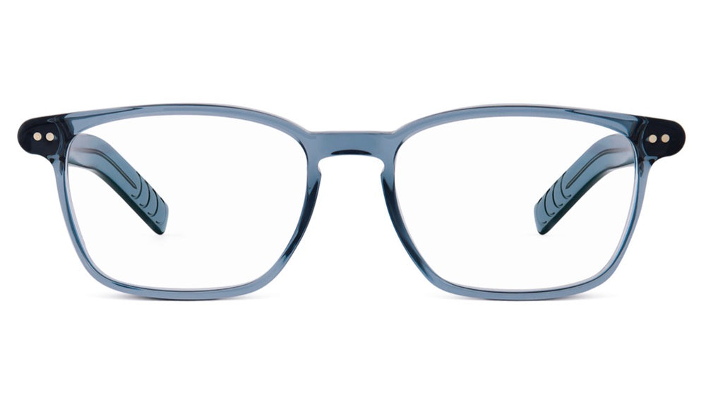 Modern rectangular eyeglasses with a translucent slate blue acetate frame. Features a classic saddle bridge and subtle rivets on the temple hinges. The frame has a refined, contemporary aesthetic with clean lines and a medium-weight construction that balances style and comfort. The sophisticated blue-grey coloring gives these frames a versatile, professional appearance suitable for both casual and formal settings.
