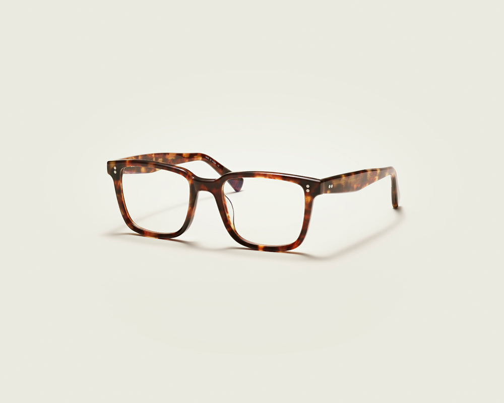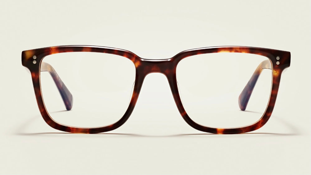 Classic square wayfarer-style frames in a rich tortoiseshell pattern with warm amber and dark brown tones. The frames feature subtle silver dot details on the front corners. The temple arms have a slight taper and appear to have a textured or striped pattern near the tips. The overall design is sophisticated and versatile, suitable for both professional and casual wear.