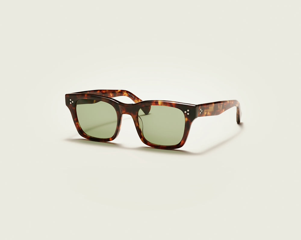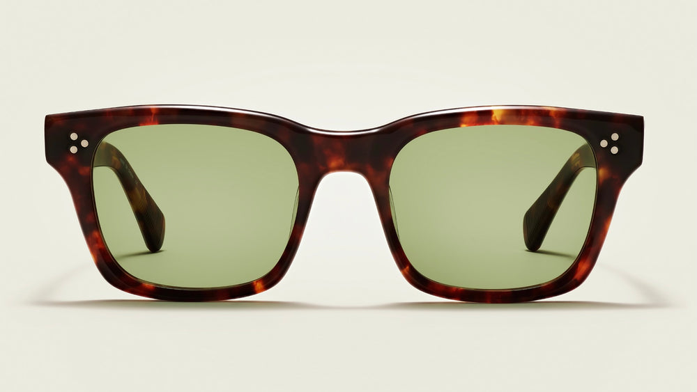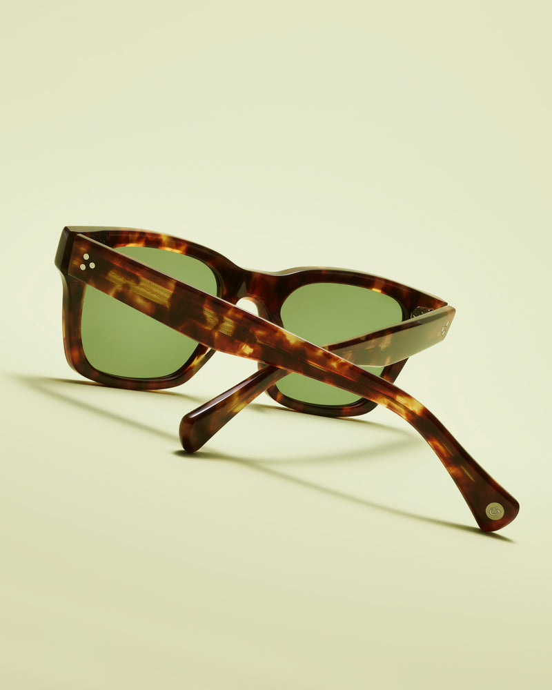 Classic wayfarer-style sunglasses featuring a rich tortoiseshell acetate frame with subtle variations in the pattern. The frames have a substantial squared-off silhouette with green-tinted lenses. Small signature dots appear on the front corners of the frames. The design exhibits a timeless vintage-inspired aesthetic with modern refinements.