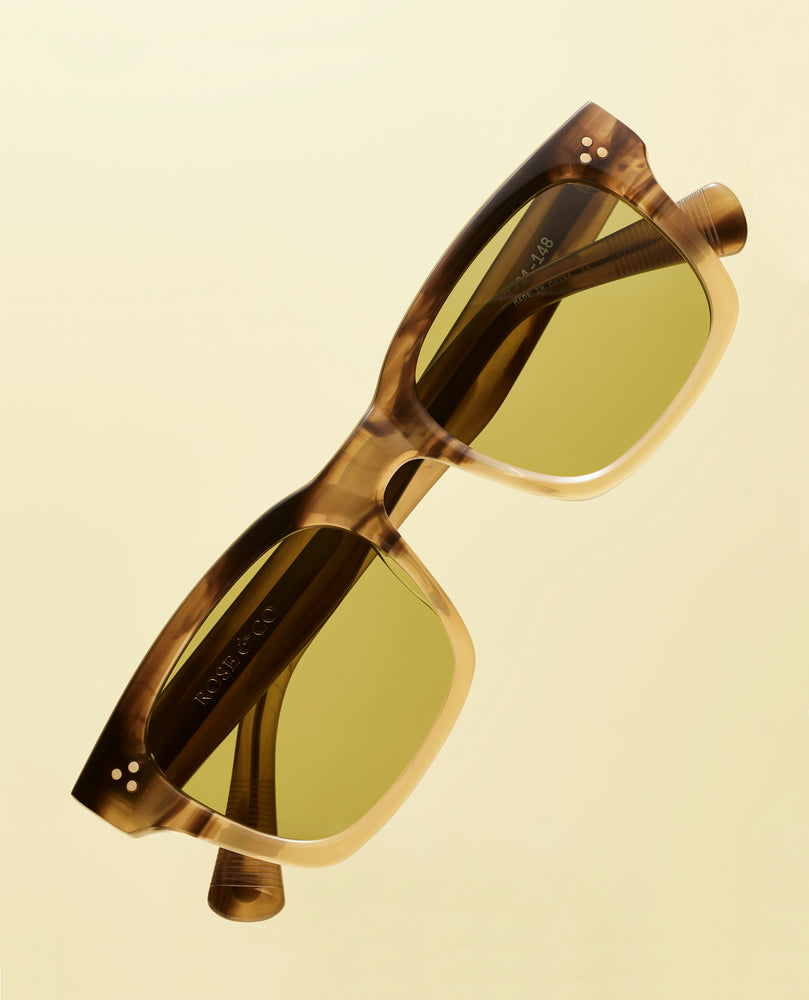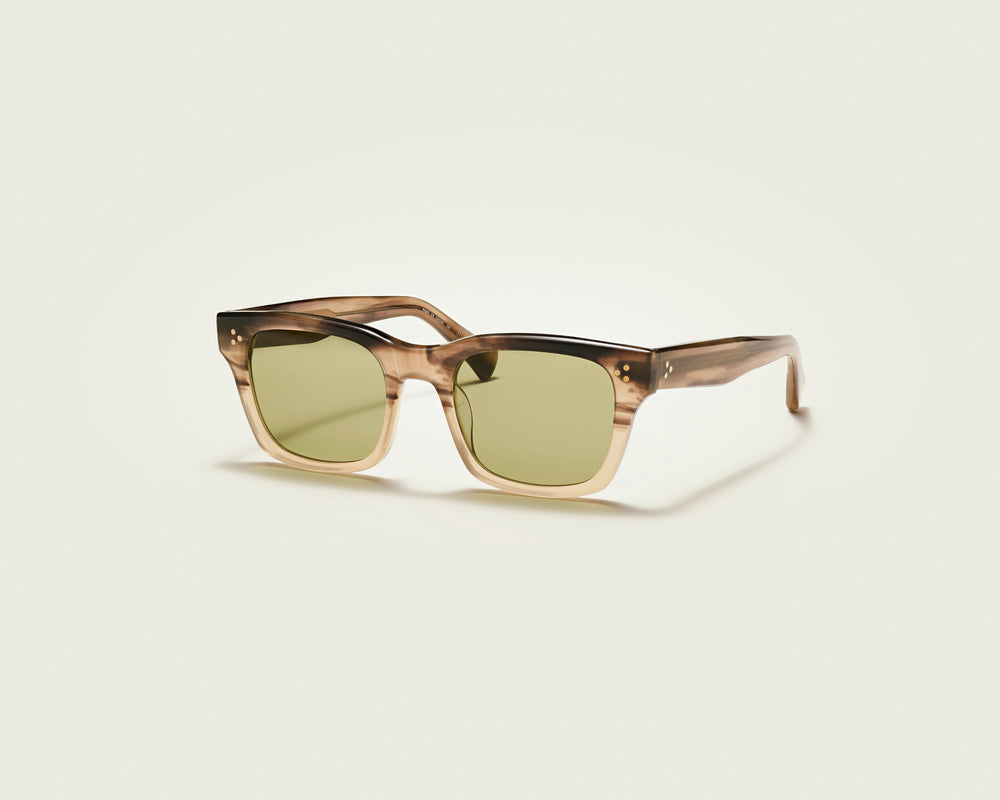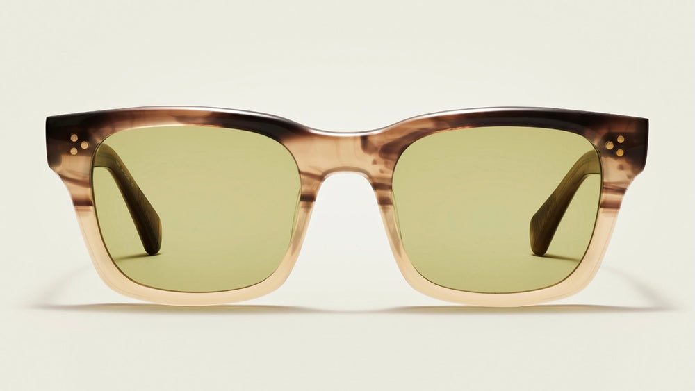 These are sophisticated square-framed sunglasses featuring a gradient tortoise to beige transparent frame coloration. The frame has a contemporary chunky design with subtle dot detailing on the temples. The lenses are a muted olive green color that complements the warm tones of the frame. The overall aesthetic is refined and modern, suitable for everyday wear with a hint of vintage appeal. The gradient effect on the frame, transitioning from darker at the top to lighter at the bottom, adds a unique design element.