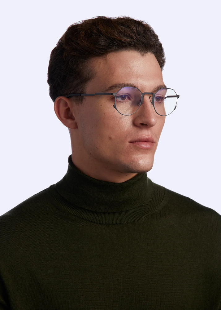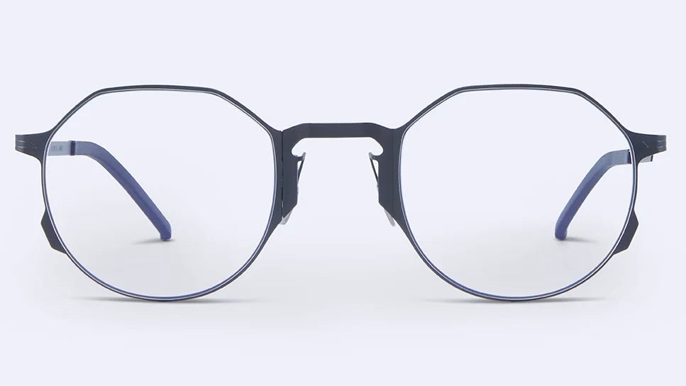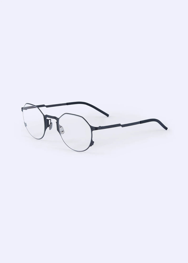 Modern geometric-shaped eyeglasses featuring an octagonal frame design in a dark navy blue metallic finish. The frames have a sophisticated minimalist aesthetic with clean lines and angular corners that create a distinctive architectural look. The thin metal construction gives them a lightweight, contemporary feel while maintaining structural integrity. The nose pads and temple arms are perfectly integrated into the overall sleek design. These glasses showcase excellent Italian craftsmanship with precise attention to detail in the metalwork and finishing. The transparent lenses are housed within the angular geometric shape, creating an intellectual yet fashion-forward appearance suitable for both professional and casual wear.