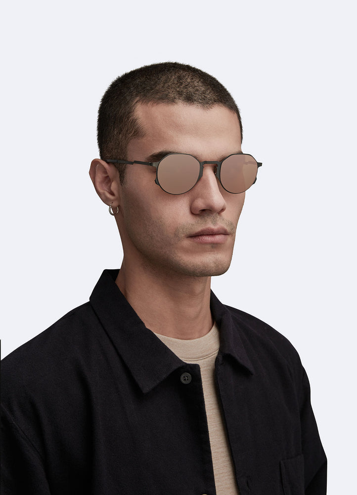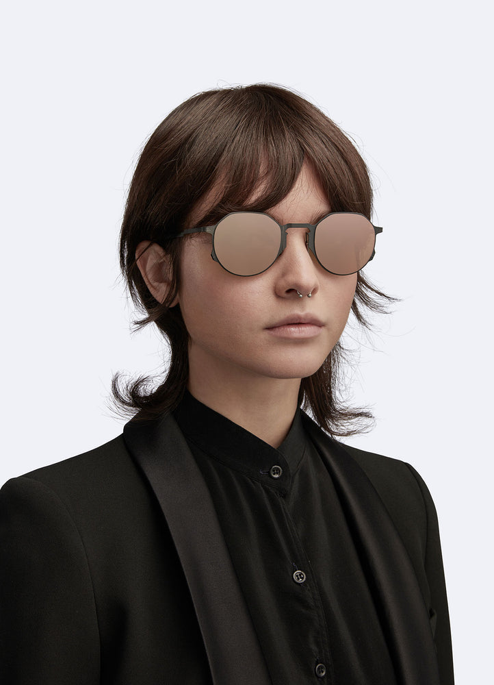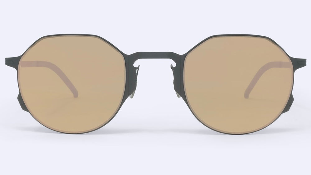 These sleek, modern round sunglasses feature a minimalist geometric design with an industrial aesthetic. The black metal frame has a matte finish and distinctive angular details where the temple arms meet the front frame. The lenses have a warm brown tint and the overall construction appears lightweight yet durable. The design strikes a balance between vintage-inspired round shapes and contemporary architectural elements, making them suitable for various face shapes and style preferences. The nose pads appear adjustable for customized fit.