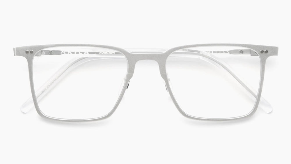 These modern, minimalist rectangular frames feature an ultra-lightweight silver metal construction throughout. The sleek design includes thin temple arms with subtle detailing near the hinges, and a clean-lined silhouette that works well with both casual and professional looks. The glasses have a contemporary floating lens design with nose pads for comfortable wear, making them an excellent choice for everyday prescription eyewear. The refined aesthetic is enhanced by the transparent lenses and consistent metallic finish across all components.