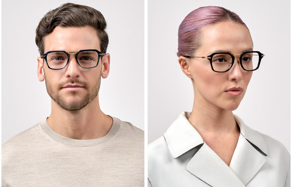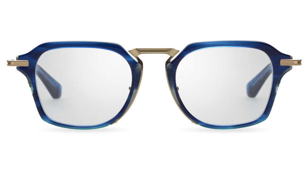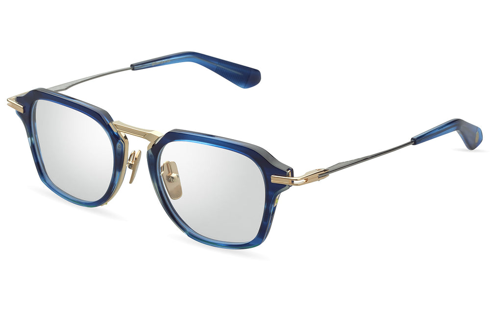 Sophisticated hybrid geometric frames featuring a striking combination of deep blue acetate front with gold metal accents. The design showcases an architectural double bridge construction with elegant nose pads and refined metal temple arms. The frame demonstrates exceptional attention to detail with its unique angular shape and premium finish, perfect for the fashion-forward professional seeking both style and functionality.