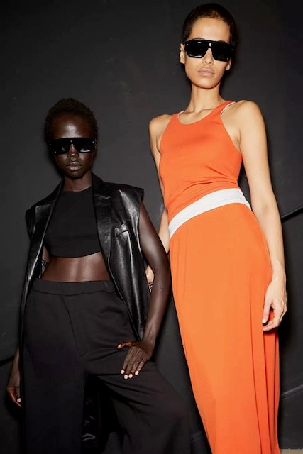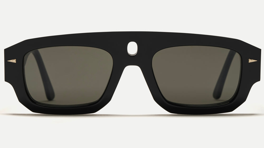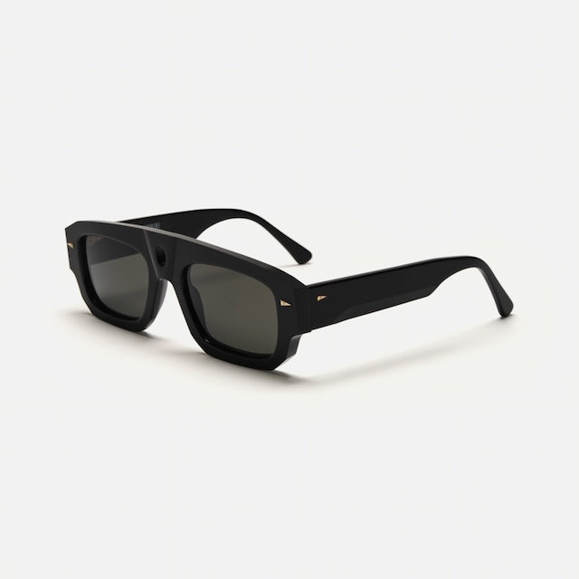 A bold, avant-garde pair of sunglasses featuring a distinctive geometric silhouette with an architectural influence. The thick black matte plastic frame has a strong, sculptural quality with angular edges and a prominent bridge detail. The design includes subtle gold-toned metal accents at the temples. The chunky, modernist aesthetic is balanced by dark tinted lenses. These sunglasses appear to be part of a designer collaboration, combining high fashion with functional eyewear design. The overall look is minimalist yet statement-making, ideal for those seeking contemporary luxury eyewear with an artistic edge.