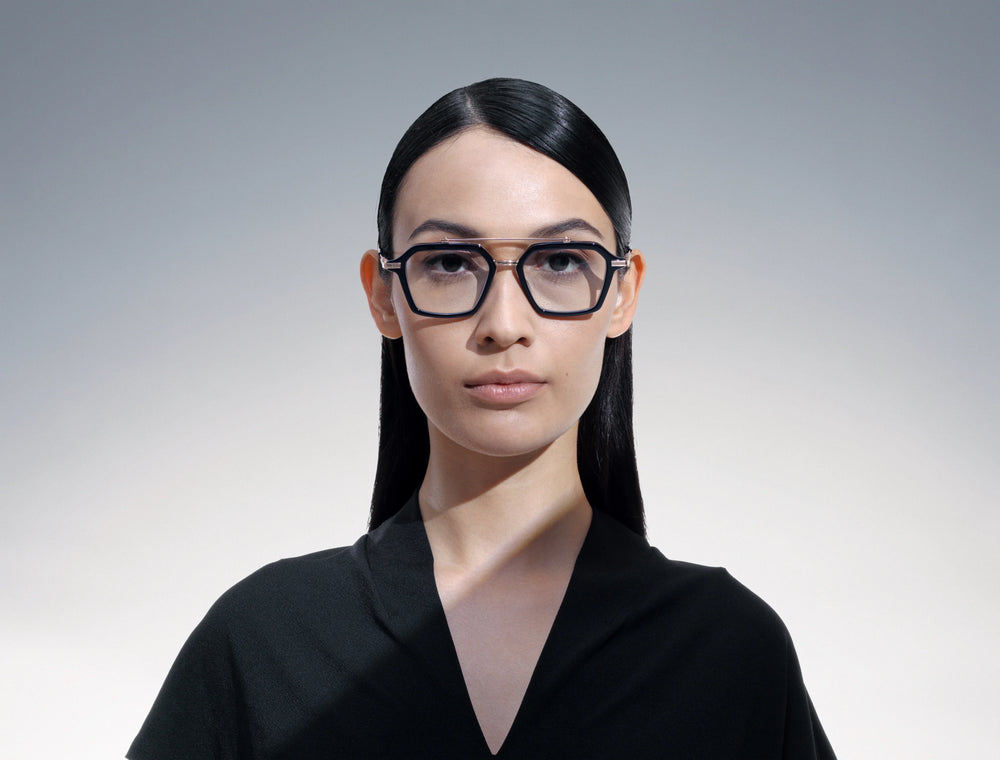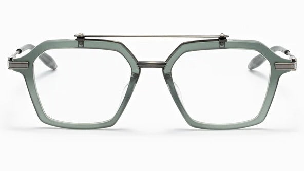 These sophisticated eyeglasses feature a unique geometric shape with a sage green acetate frame and metallic accents. The distinctive double bridge design adds an architectural element, while the angular silhouette creates a bold, contemporary look. The frames combine modern styling with premium materials, featuring precise metalwork and a balanced proportion that would suit most face shapes. The design incorporates subtle industrial details with sleek temple arms and adjustable nose pads for comfort.
