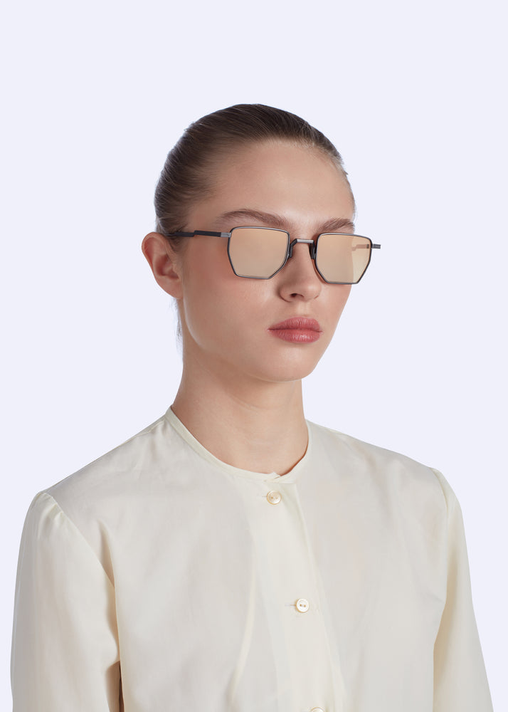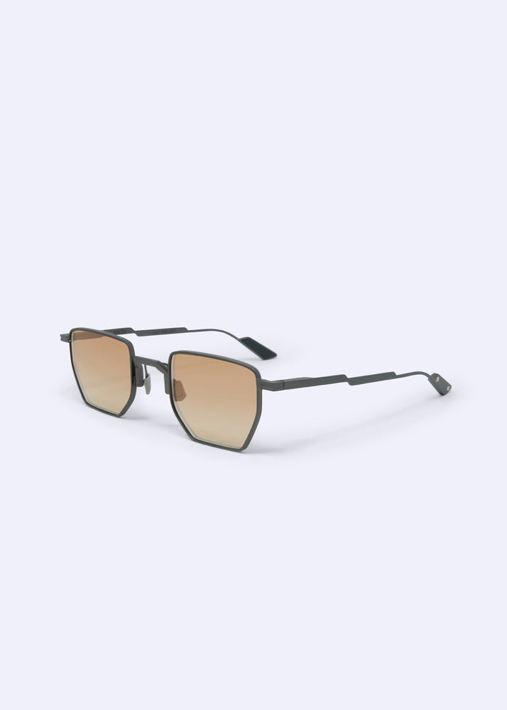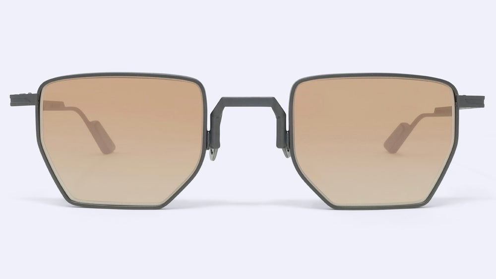 These sleek, modern sunglasses feature an unconventional geometric hexagonal shape with a minimalist metal frame design. The lenses have a stylish bronze-tinted gradient effect, complemented by the industrial-looking gunmetal grey frame. The angular design gives these sunglasses a distinctive avant-garde aesthetic while maintaining a sophisticated profile. The thin metal construction creates a lightweight, contemporary feel that would appeal to fashion-forward individuals looking for unique eyewear.