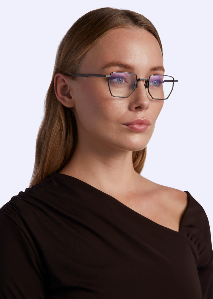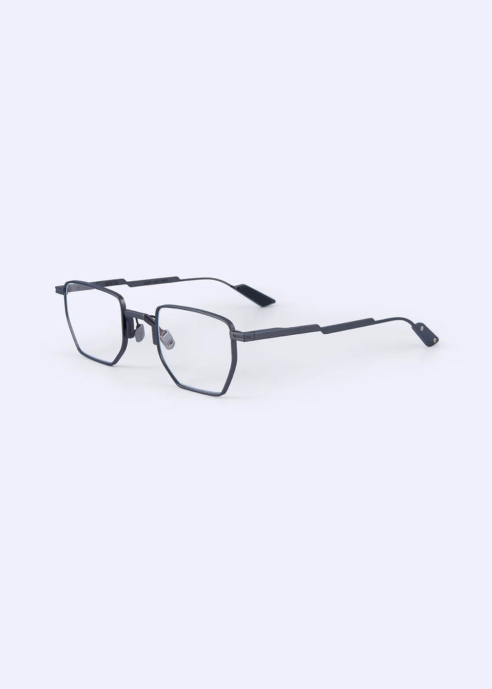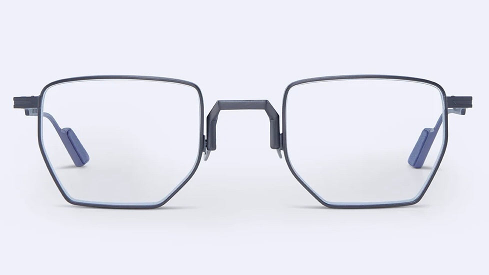 These distinctive geometric frames feature an angular hexagonal shape with a modern minimalist aesthetic. The thin metallic frame in matte grey is complemented by blue temple tips, creating a sophisticated yet edgy look. The design incorporates sleek nose pads and clean lines throughout, making it a contemporary choice for those seeking architectural eyewear with an avant-garde sensibility.
