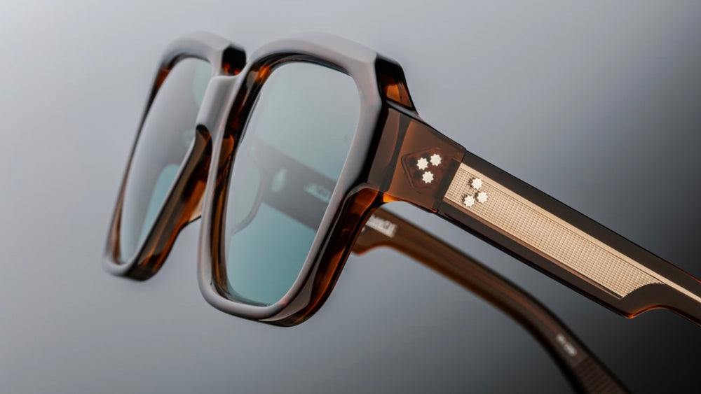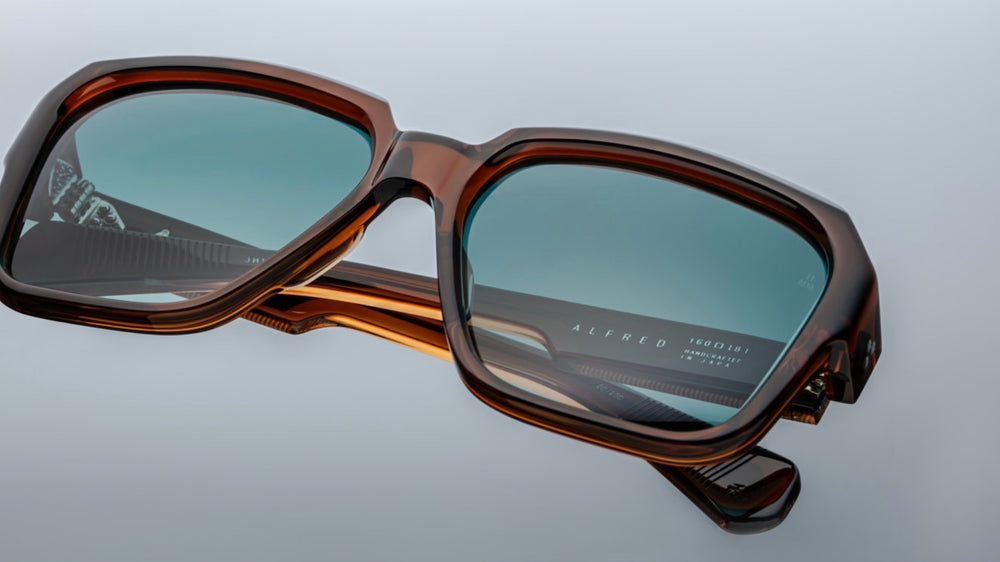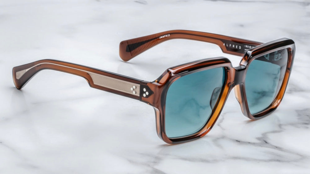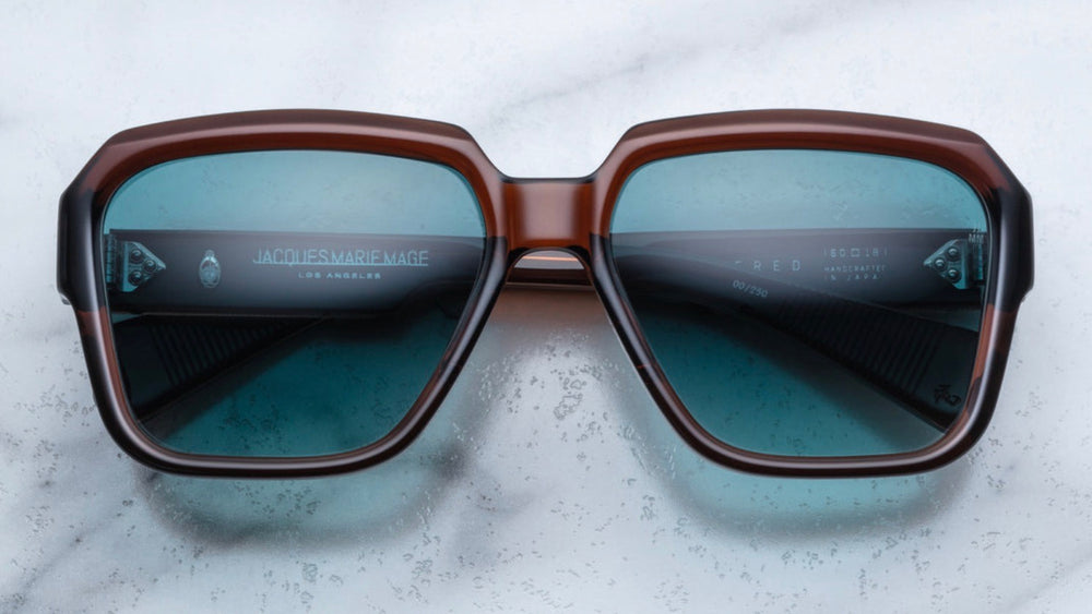 The JACQUES MARIE MAGE ALFRED is a bold, oversized square-framed sunglasses with a luxurious translucent brown acetate construction. The chunky, architectural design features clean lines and pronounced angles, creating a sophisticated retro-modern aesthetic. The frames showcase a deep, rich brown colorway with blue-tinted lenses that add a cool contrast. The substantial build quality is evident in the thick temple arms and bridge, while maintaining elegant proportions. These sunglasses embody a perfect blend of vintage inspiration and contemporary luxury design elements.