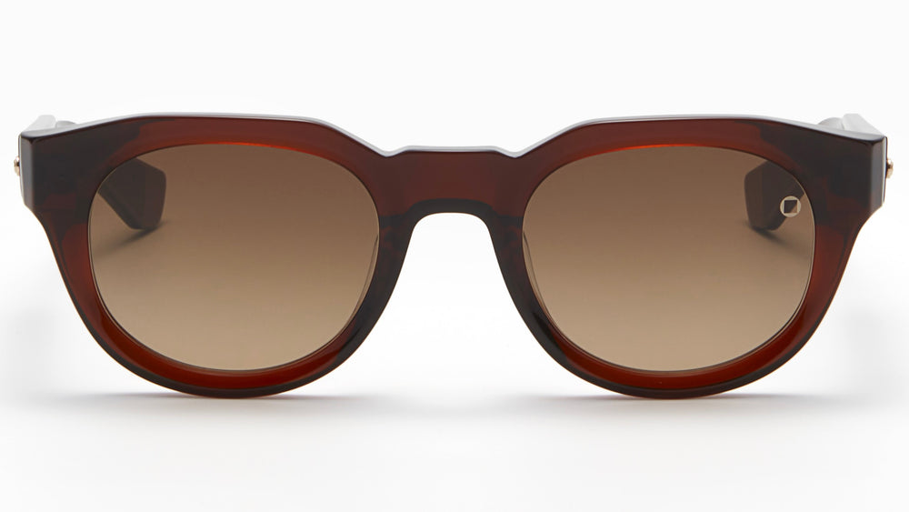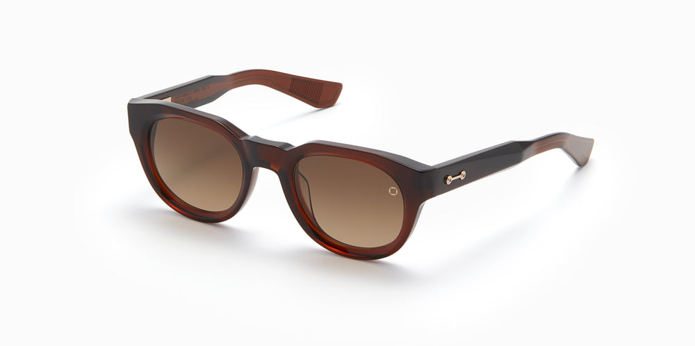 Classic round sunglasses featuring a rich brown acetate frame with a gradient brown lens tint. The frame has a substantial build with smooth curves and a vintage-inspired silhouette. The design showcases clean lines with minimalist detailing, making it versatile for everyday wear. The warm brown coloring gives these sunglasses a sophisticated, timeless appeal while maintaining modern functionality.