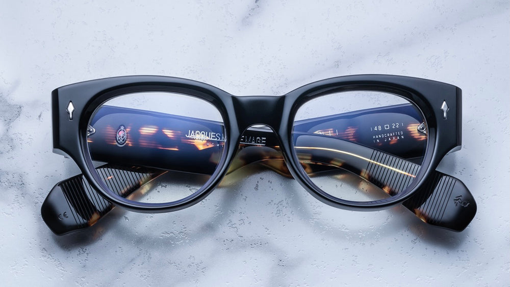 The JACQUES MARIE MAGE Altabani features a bold, geometric silhouette with thick black acetate frames. The front face showcases a distinctive angular design with diamond-shaped accents at the temples. The arms transition beautifully into a tortoiseshell pattern, adding sophistication to the otherwise stark design. The lenses are generously sized and the frame has a premium, handcrafted quality evident in its construction. The bold, architectural aesthetic is balanced by classic proportions, making it a statement piece that maintains wearability.