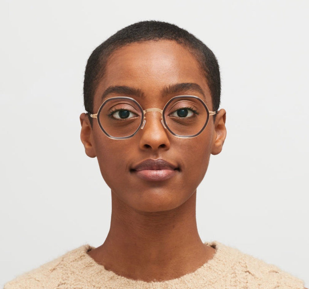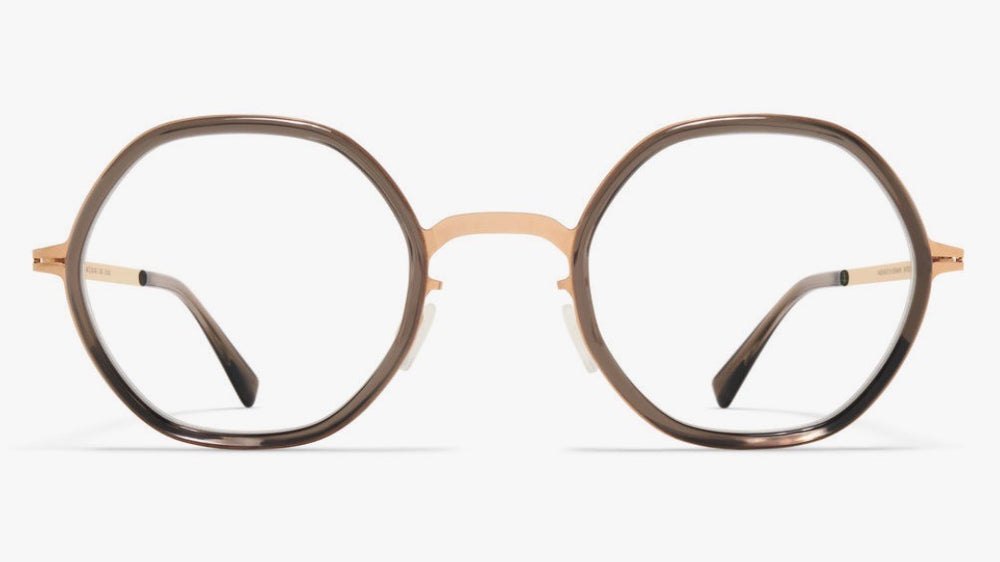 These are sophisticated round eyeglasses featuring a delicate brown acetate rim around the lenses combined with a gold-tone metal framework. The design showcases a minimalist aesthetic with thin temple arms and a sleek nose bridge system. The frames have a distinctive vintage-inspired look while maintaining a modern sensibility through its mixed material construction. The circular shape is perfectly balanced, making them suitable for various face shapes. The combination of warm brown and gold tones creates an elegant, versatile appearance suitable for both professional and casual wear.