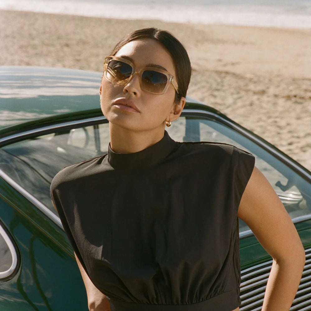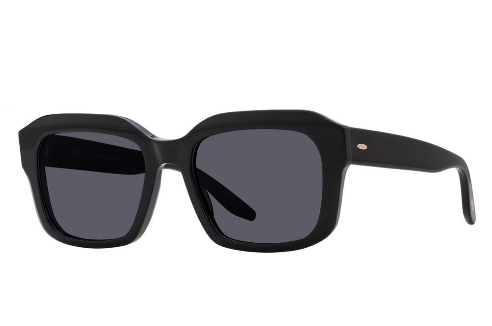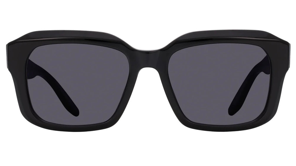 Bold oversized square sunglasses with a sleek modern design. The frame features a chunky, architectural silhouette with clean lines and substantial temples. The matte black finish gives it a sophisticated, minimalist look while the grey lenses provide excellent sun protection. The saddle bridge creates a comfortable fit, and the overall aesthetic strikes a balance between fashion-forward and timeless styling.