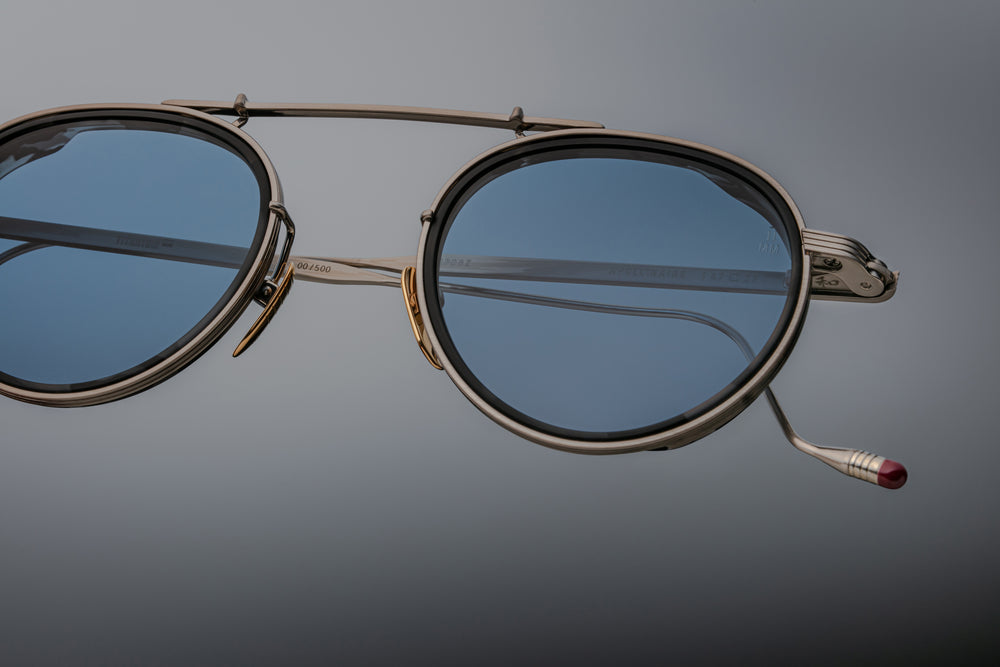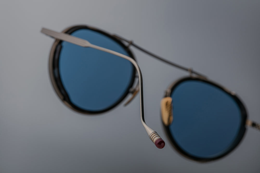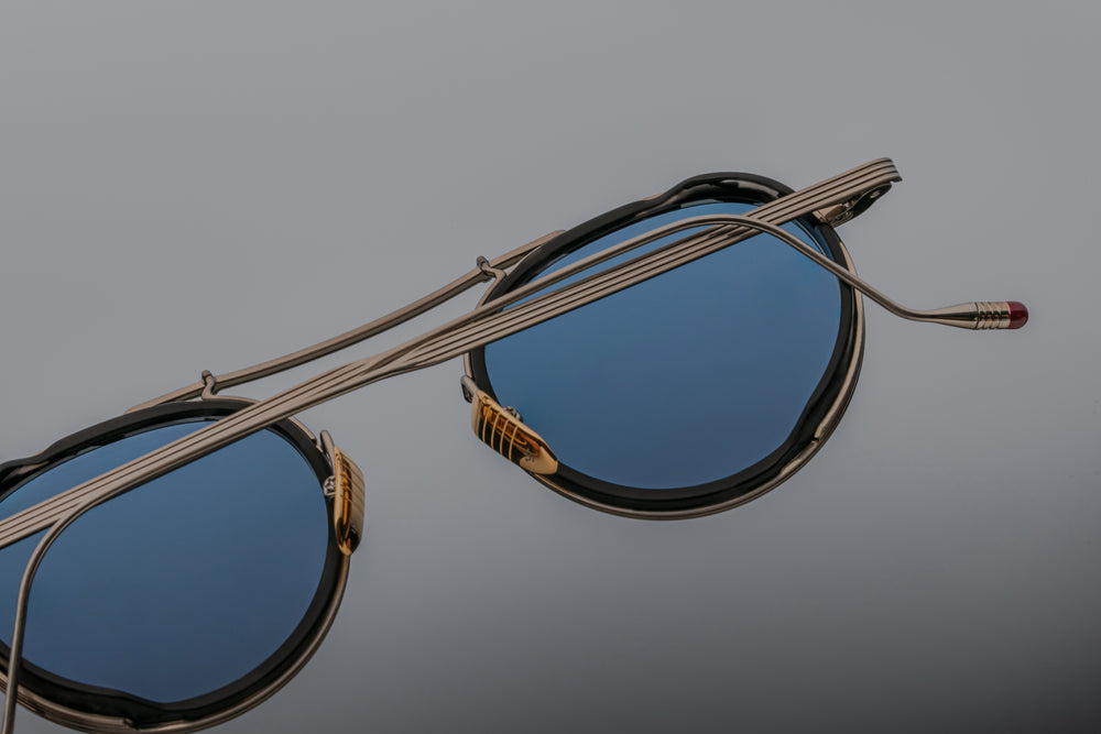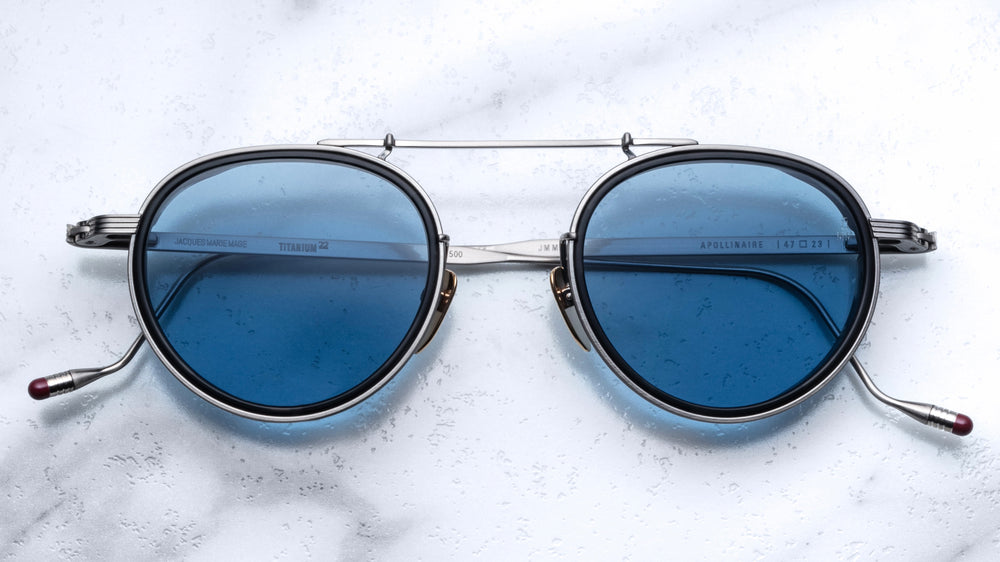 Sophisticated round titanium sunglasses with a striking double bridge design. Features black rim detailing around blue-tinted lenses, delicate nose pads, and sleek metallic temple arms with subtle burgundy end tips. The frame exhibits excellent craftsmanship with its precise proportions and premium finish, characteristic of Jacques Marie Mages attention to detail. The classic round shape is modernized with contemporary materials and styling.