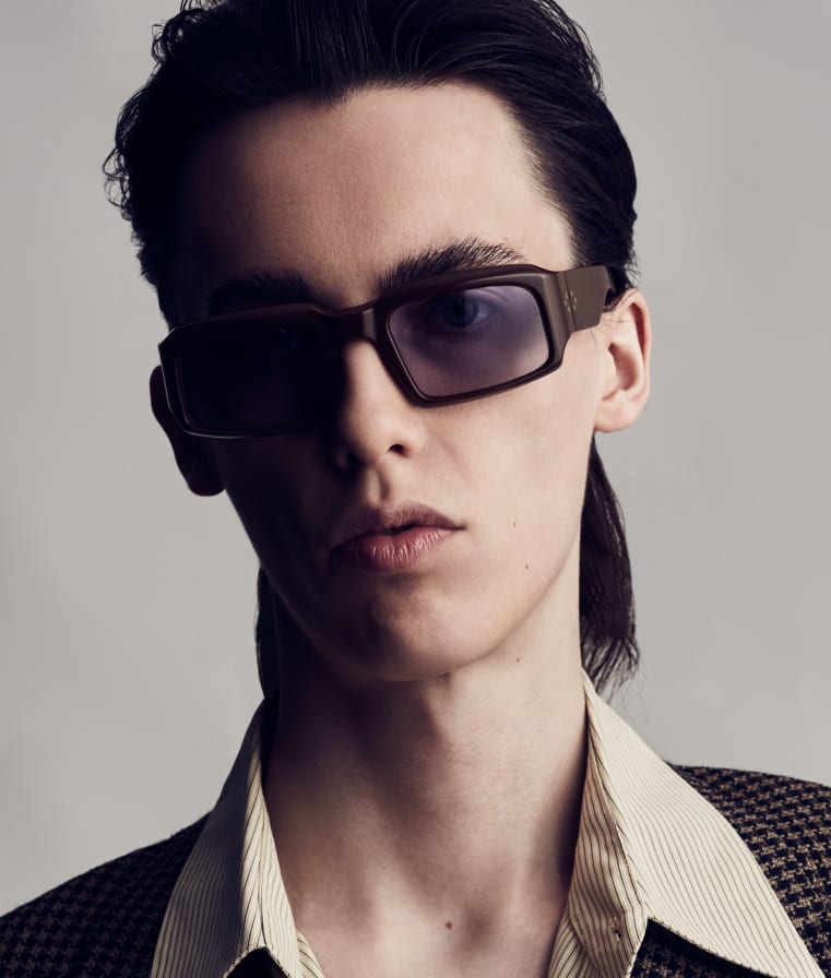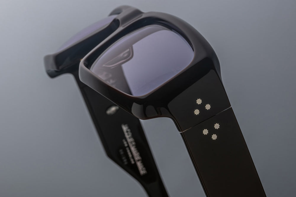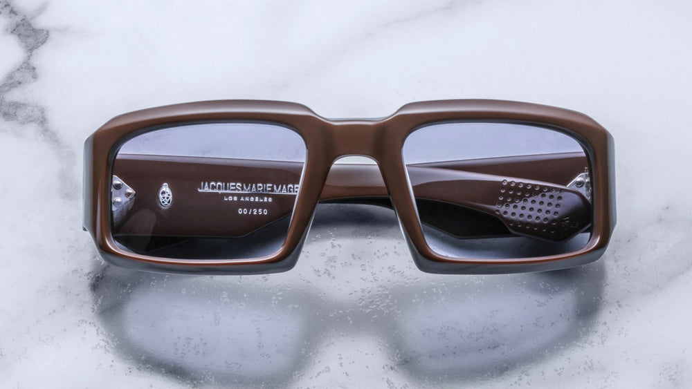 A sophisticated pair of thick-framed rectangular glasses from Jacques Marie Mages limited edition series (numbered 00/250). The frames feature a luxurious matte brown finish with a substantial, bold silhouette. The temples showcase subtle studded detailing, adding a distinctive design element. The overall aesthetic is high-end, architectural, and distinctly masculine with clean lines and premium craftsmanship typical of the JMM brand.