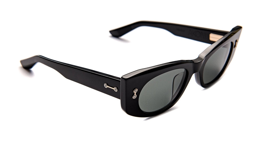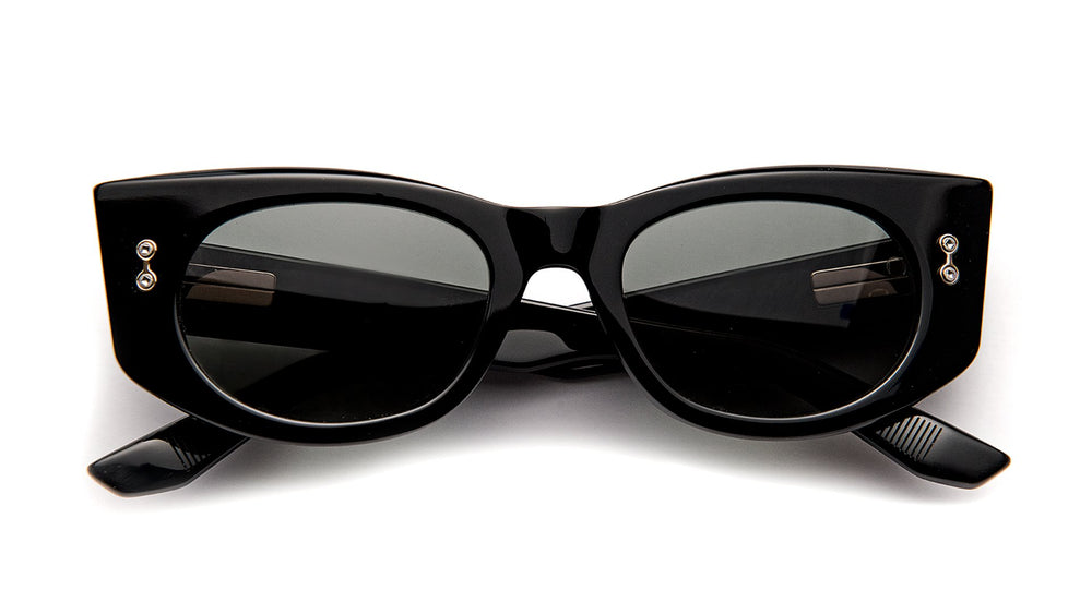 A bold, retro-inspired rectangular sunglasses design featuring chunky black acetate frames with a distinctive vintage appeal. The frame has an elegant, oversized silhouette with prominent temples and subtle metal detailing on the front corners. The dark lenses complement the classic black frame, creating a timeless, sophisticated look suitable for any occasion. The substantial build quality and thick temple arms suggest durability and premium construction.