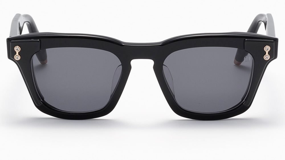 These modern and bold square sunglasses feature a thick black acetate frame with a chunky silhouette. The design includes decorative gold-tone hinges on each temple. The grey-tinted lenses provide excellent sun protection while maintaining a sleek aesthetic. The temple arms are substantial and well-proportioned to the front frame, creating a balanced contemporary look suitable for any face shape.