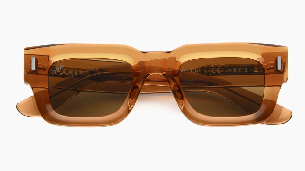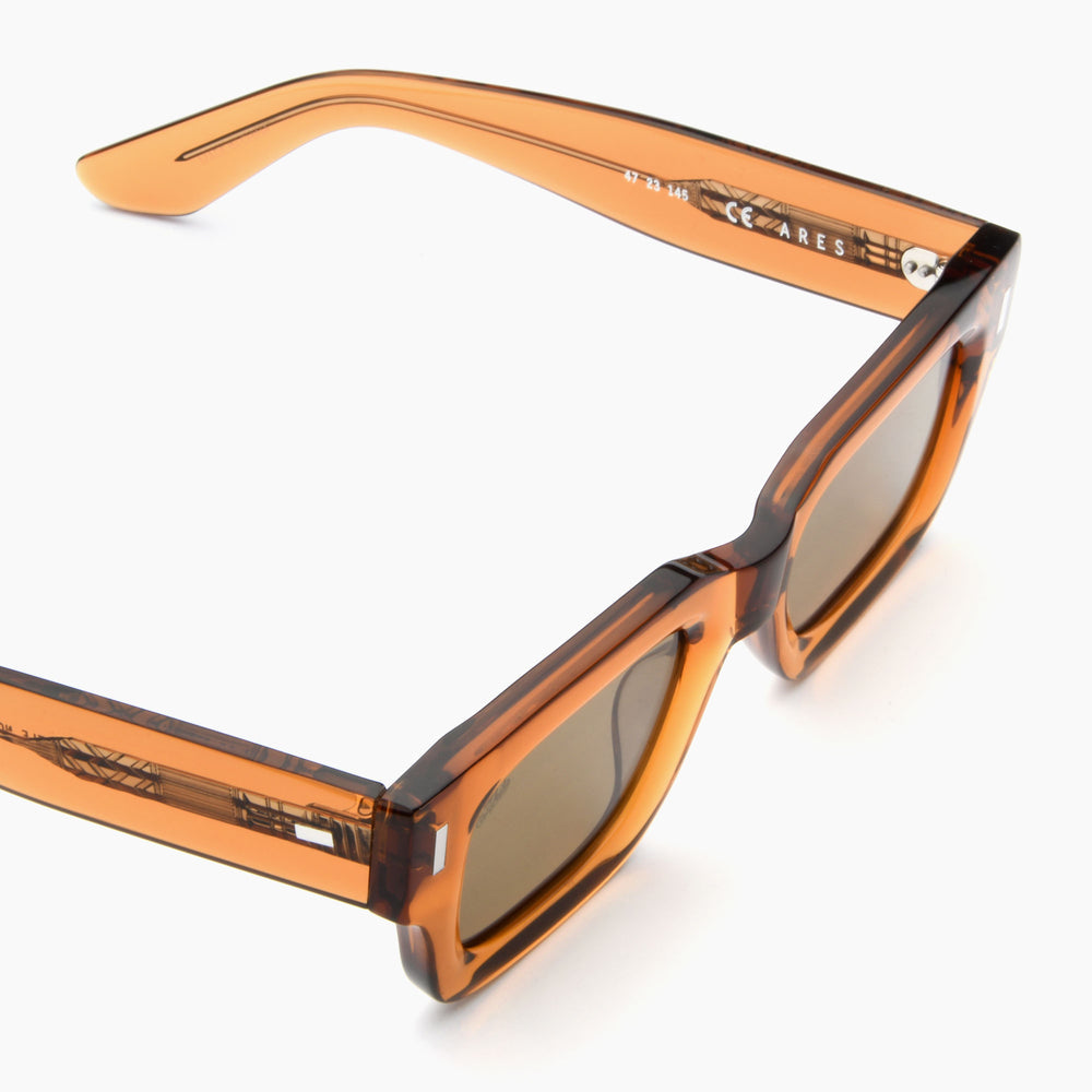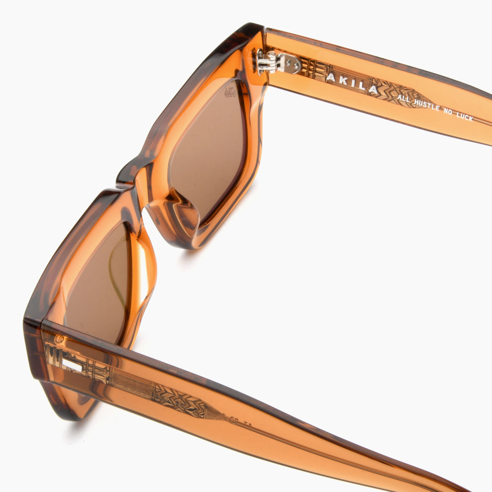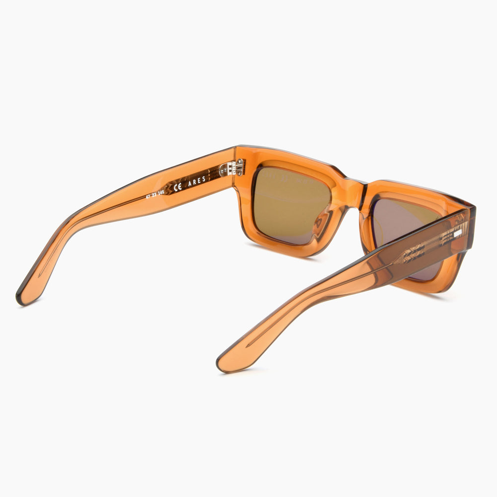 Modern, bold chunky square sunglasses in a translucent amber/orange colorway. Features a distinctive sculptural silhouette with thick frames and temples. The gradient brown lenses complement the warm tones of the frame. The design has clean architectural lines with a contemporary retro-futuristic aesthetic. Notable for its bold proportions and minimalist yet statement-making design.