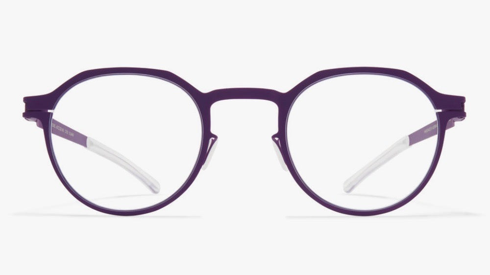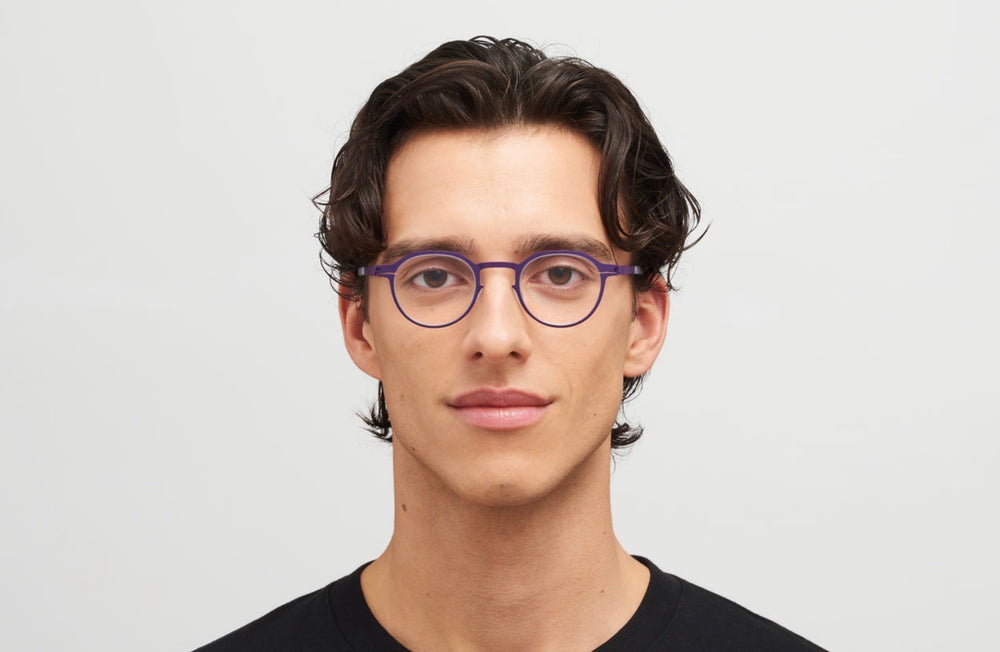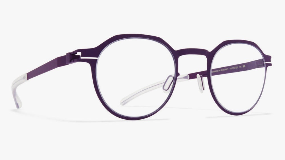 These modern round frames feature a minimalist design with a thin purple metal construction throughout. The frame has a sophisticated matte finish with clean lines and subtle architectural details at the temple hinges. The slender nose bridge with adjustable nose pads ensures a comfortable fit. The white temple tips provide an elegant contrast to the purple metal frame. The overall aesthetic is sleek and contemporary while maintaining a classic circular silhouette.