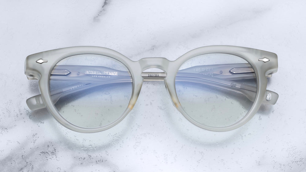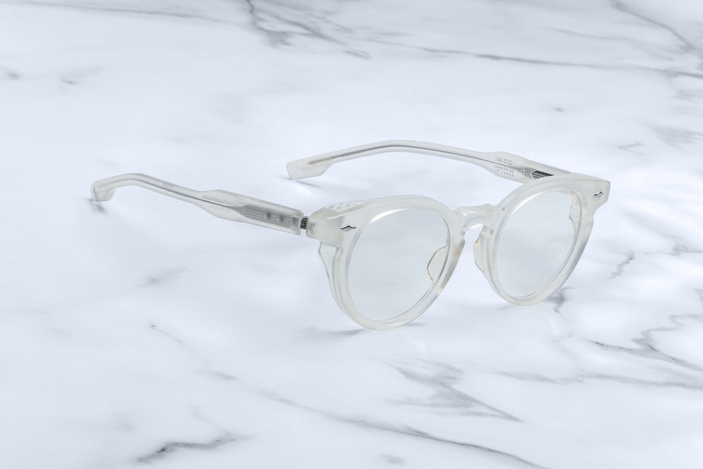 A sophisticated pair of thick-rimmed round eyeglasses in a matte frosted grey finish. The frames feature a vintage-inspired silhouette with prominent round lenses and a substantial acetate construction. The design showcases subtle architectural details at the temple hinges and a classic saddle bridge. These glasses embody a refined, intellectual aesthetic with their substantial build and neutral colorway.