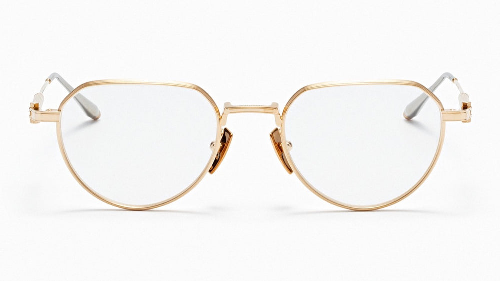 A sophisticated pair of round gold-framed glasses with a classic aviator-inspired silhouette. The thin metal construction gives these frames a delicate and refined appearance. The frames feature adjustable nose pads and slender temple arms that blend seamlessly with the overall design. The transparent lenses are housed within the perfectly circular rims, creating a timeless and elegant look suitable for both professional and casual settings.