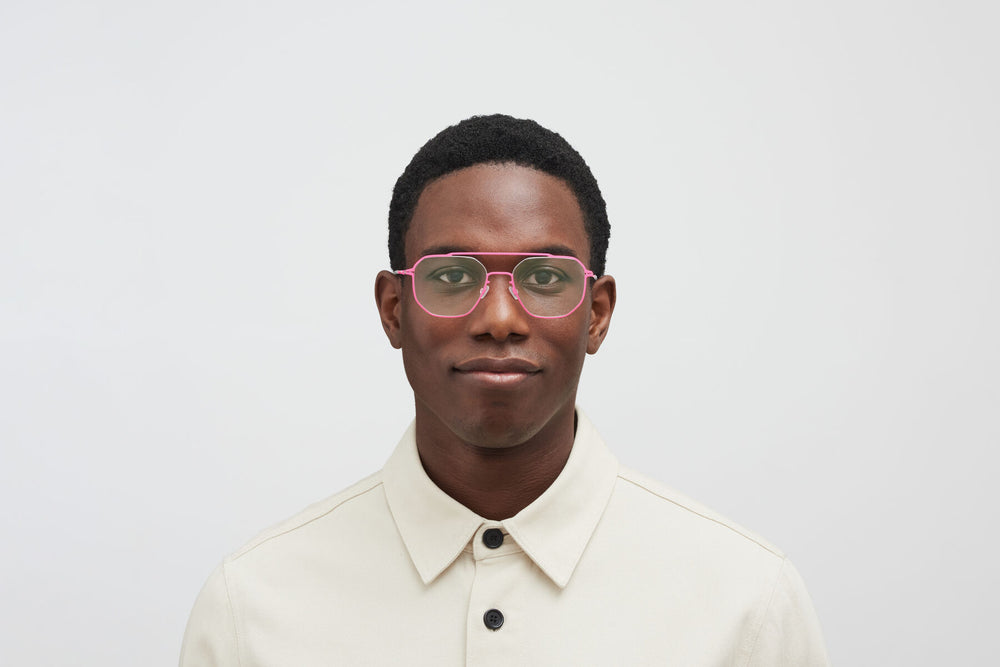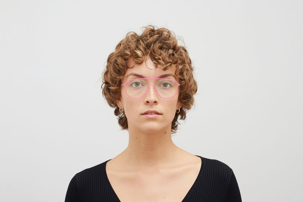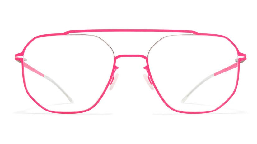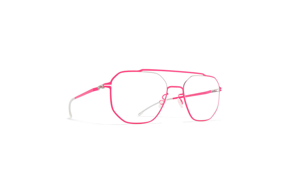 Modern minimalist aviator-inspired frames featuring a distinctive geometric silhouette. The sleek hot pink metal construction creates a bold yet refined aesthetic. The thin profile and angular design offer a contemporary take on classic eyewear, with a clean double bridge and adjustable nose pads for optimal fit. The frames architectural lines and bright color make it an eye-catching choice for fashion-forward individuals.